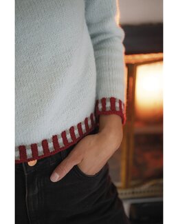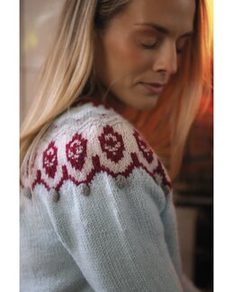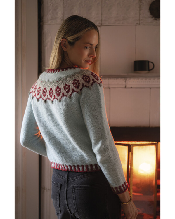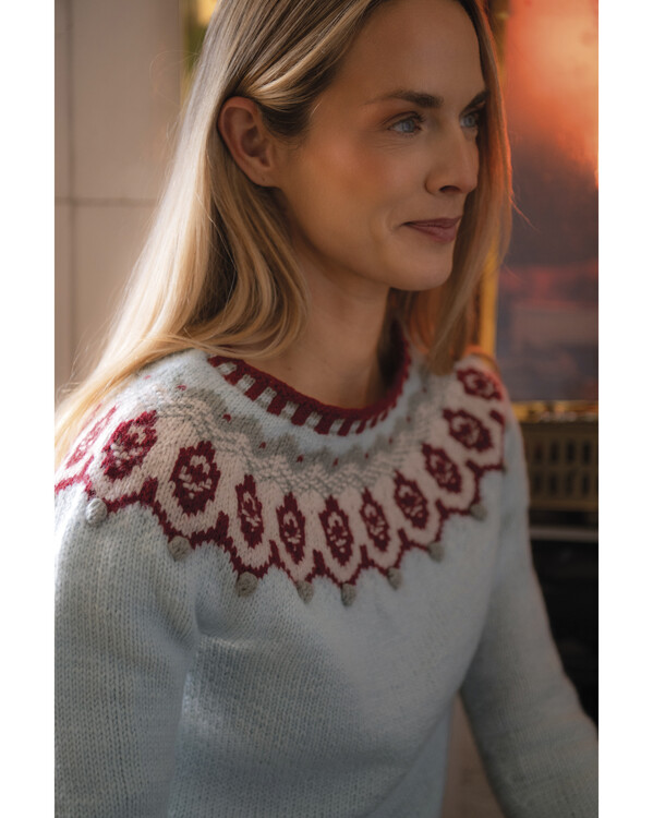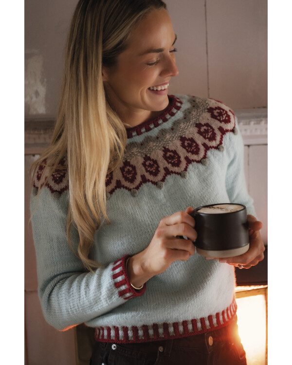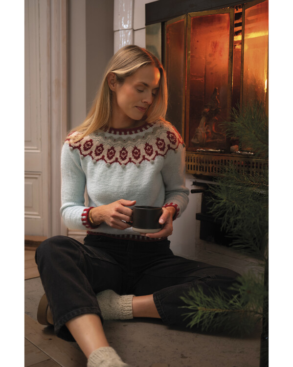 Klassinen jouluneulepusero, jossa on pohjoismainen kuviointi ja pehmeät, talviset värit. Vaaleansininen pohja korostuu kauniisti viininpunaisten ja valkoisten raitojen rinnalla, jotka kulkevat kaarrokkeen yli – ajaton yhdistelmä, joka tuo raikkaan ja huurteisen tunnelman.