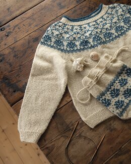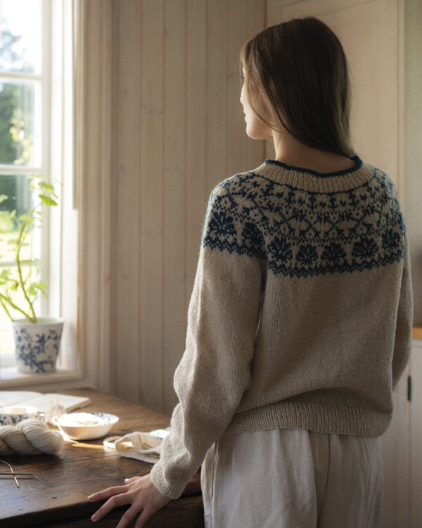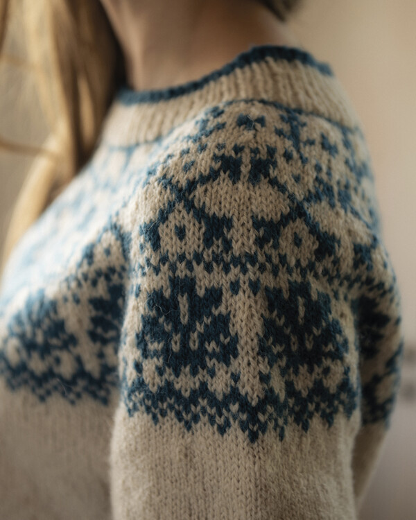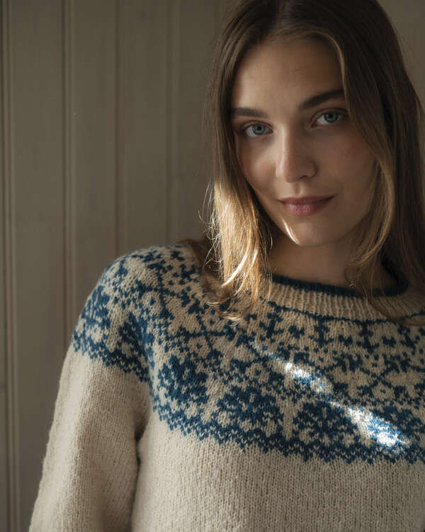 Klassinen neulepusero, jossa on koristeellinen monivärinen kaarroke pohjoismaiseen tyyliin. Pehmeä perusväri yhdistyy ka...