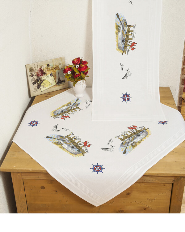 Koko: Pöytäliina noin 80 x 80 cm, kaitaliina noin 40 x 100 cm