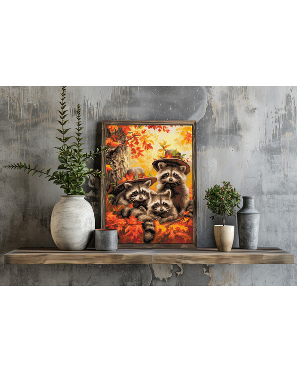 Tule mukaan värikkääseen syysmaailmaan, jossa kolme viehättävää pesukarhua poseeraa lehtien keskellä hehkuvissa punaisen...
