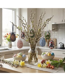 Valmiissa munissa on valkoiset ripustusnauhat, joten ne sopivat täydellisesti pääsiäisoksiin, ikkunaan tai osaksi pääsiäiskattausta.