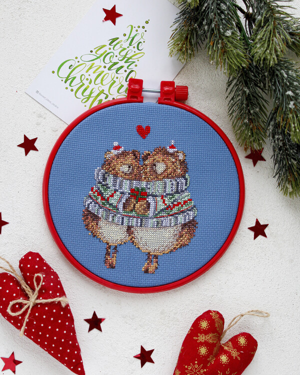 Ihastuttava ja tunnelmallinen ristipistotyö, jossa kaksi suloista pöllöä jouluisissa vaatteissa istuu tiiviisti kietoutu...