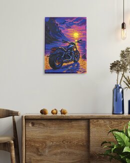 Iso moottoripyörä on pysäköity merenrantaan auringon laskiessa ja värjätessä taivaan voimakkain värein. Draamaattinen di...