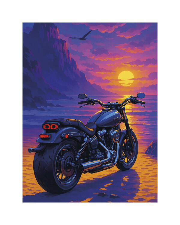 Iso moottoripyörä on pysäköity merenrantaan auringon laskiessa ja värjätessä taivaan voimakkain värein.