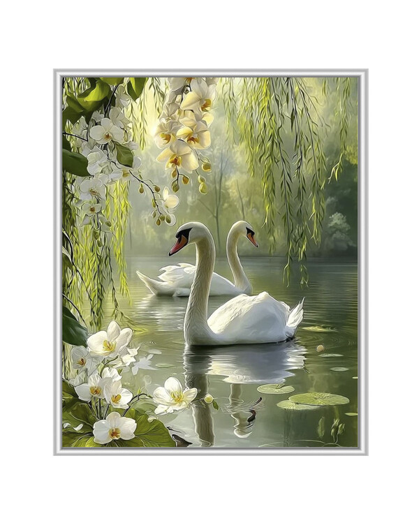 Kaksi eleganttia joutsenta kukkivassa lammessa luo romanttisen ja harmonisen diamond painting -aiheen. Pehmeät vihreän s...