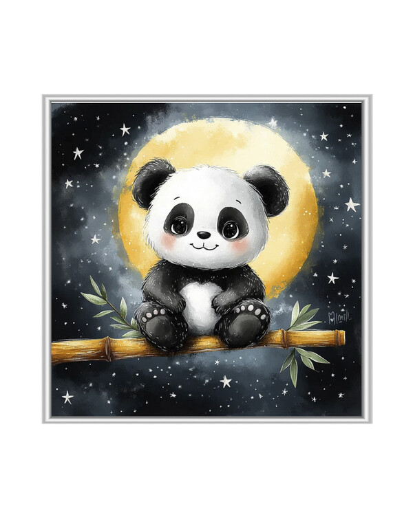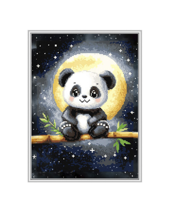 Suloinen panda istuu oksalla täydenkuun edessä ja luo ihastuttavan, tähtikirkkaan diamond painting -aiheen, joka sopii sekä lapsille että aikuisille.