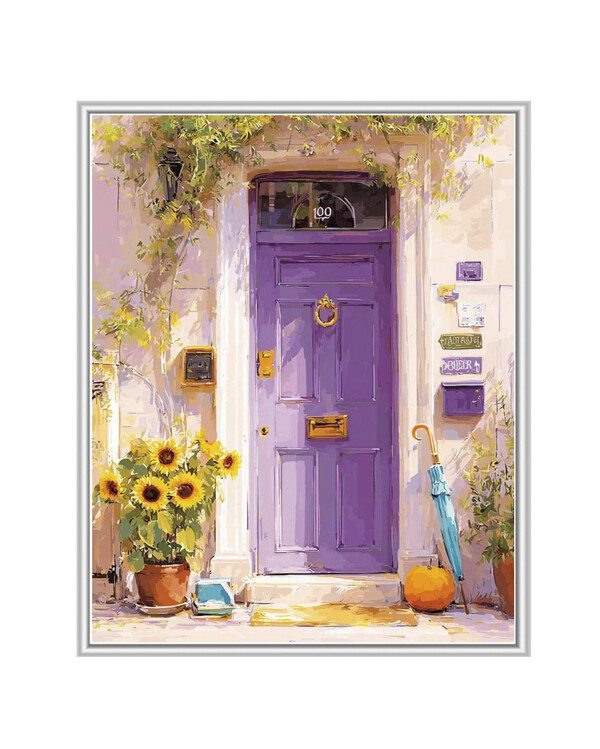 Kutsuva liila ovi kukkaruukkuineen ja auringonkukkineen herättää henkiin kodikkaan, hurmaavan talon ja kesätunnelman. Yk...