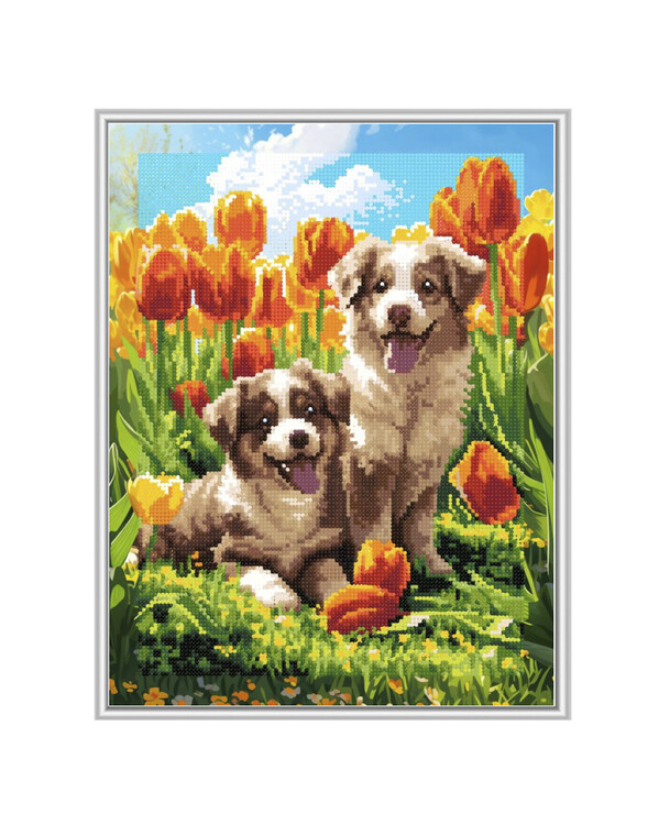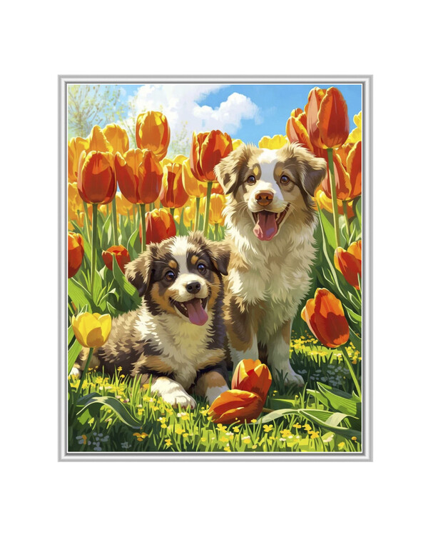 Kaksi iloista koiraa värikkäiden tulppaanien keskellä luo lämpimän ja leikkisän diamond painting -aiheen, joka sopii täydellisesti kaikille eläinrakkaille.