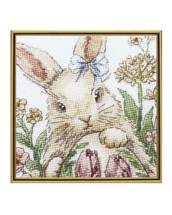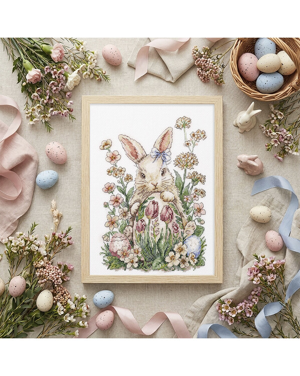 Suloinen ja leikkisä kirjontamalli, jossa pieni pupu on kukkien ja pääsiäismunien ympäröimänä. Pehmeät pastellisävyt ja ...