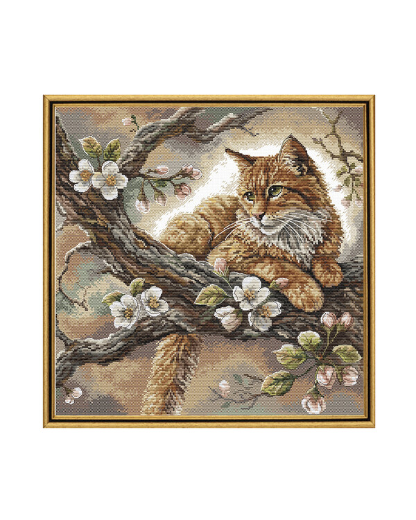 Harmoninen ja yksityiskohtainen aihe, jossa kissa lepää kukkivan omenapuun oksalla. Pehmeät sävyt ja kauniit yksityiskohtaiset kukat luovat rauhallisen ja ajattoman ilmeen, joka sopii jokaiseen kotiin.