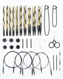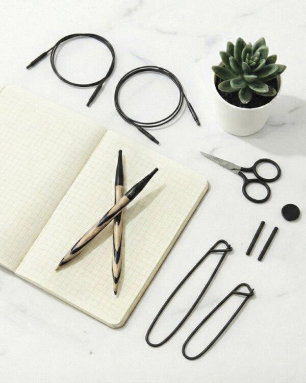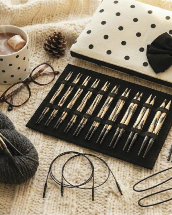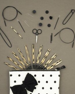 Settiin kuuluu sekä puikkoja, kaapeleita että käteviä tarvikkeita, ja se toimitetaan pilkullisessa kotelossa, jota koristaa musta rusetti – täydellinen, huolella mietitty lahja!
