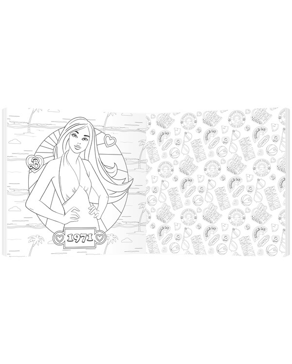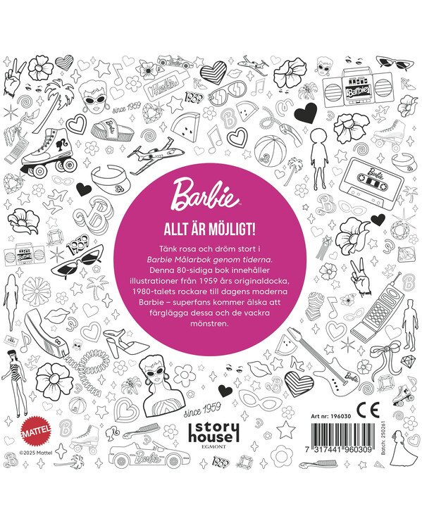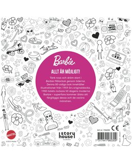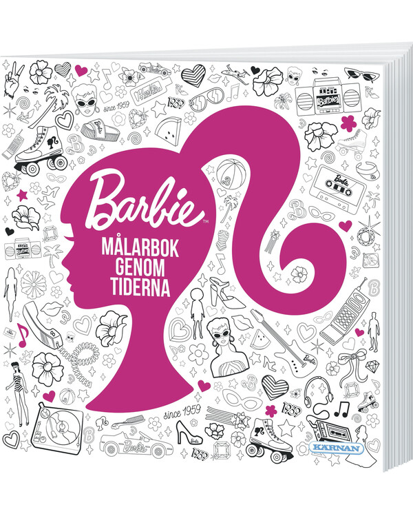 Barbie – Värityskirja läpi aikojen sisältää ikonisia kuvituksia vuoden 1959 alkuperäisnukesta, 80-luvun näyttävistä tyyleistä sekä nykypäivän modernista Barbiesta.