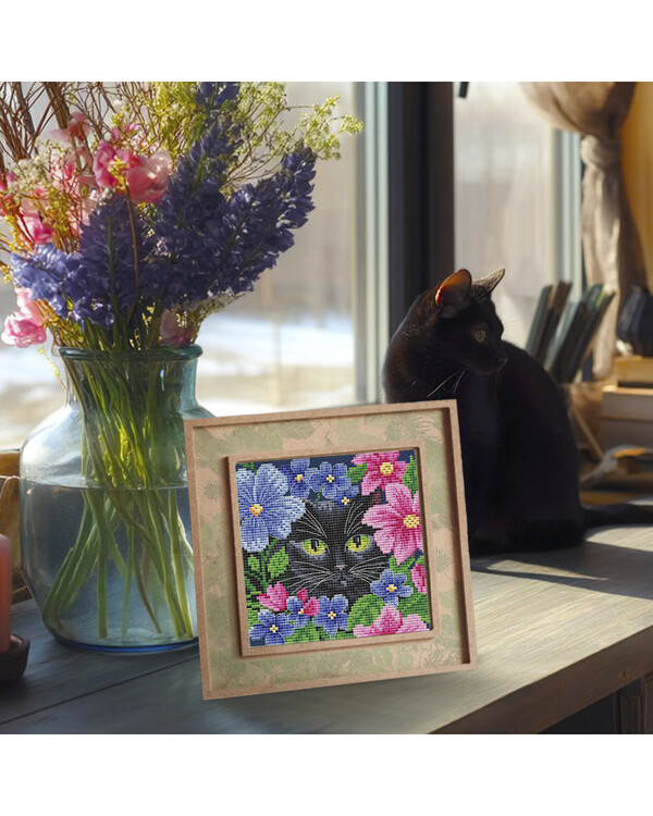 Anna tämän hurmaavan mustan kissan kurkistaa kirjontakehyksestäsi! Kirkkaiden sinisten, pinkkien ja violettien kukkien ympäröimä kirjontakuvio tuo iloista ja elävää tunnelmaa niin moderniin kuin maalaismaiseenkin kotiin.
