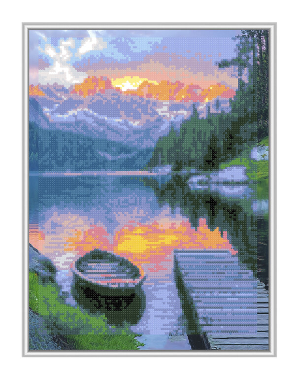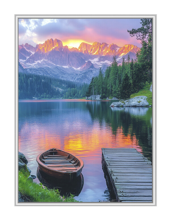 Tässä taianomaisessa kuvassa soutuvene on laiturin vieressä, vesi on peilityyni ja vuoret hehkuvat auringonlaskun väreissä.