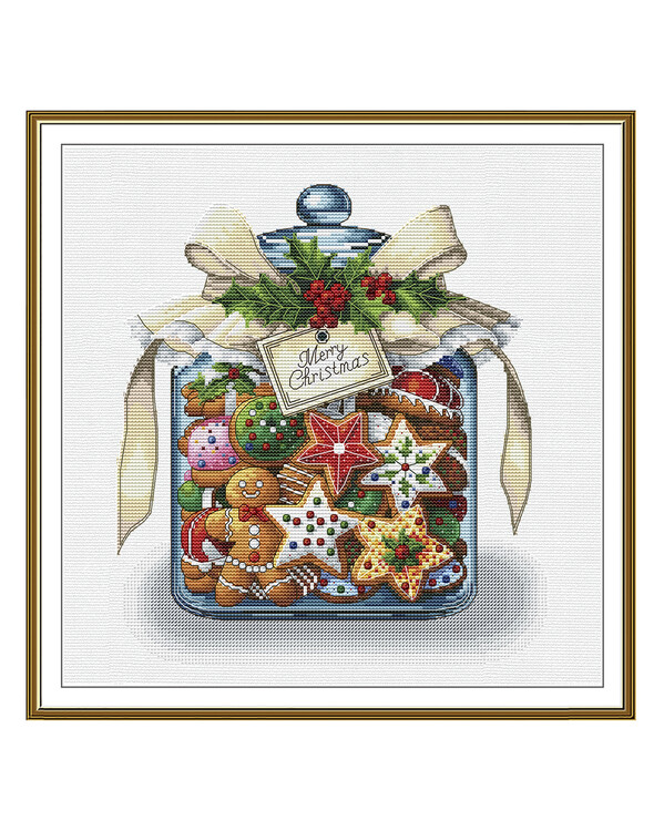 Ihana jouluinen ristipistokuvio, jossa on värikkäitä piparkakkuja ja tähdenmuotoisia keksejä kauniissa lasipurkissa, jota koristaa rusetti, orjanlaakeri ja hurmaava "Merry Christmas" -etiketti.