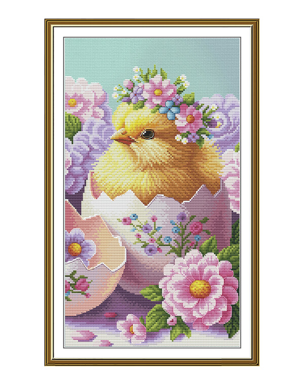 Ihastuttava ristipistokuvio, jossa suloinen pieni tipu kurkistaa koristellusta munastaan, ympärillään kauniita kukkia pehmeissä pastellisävyissä.