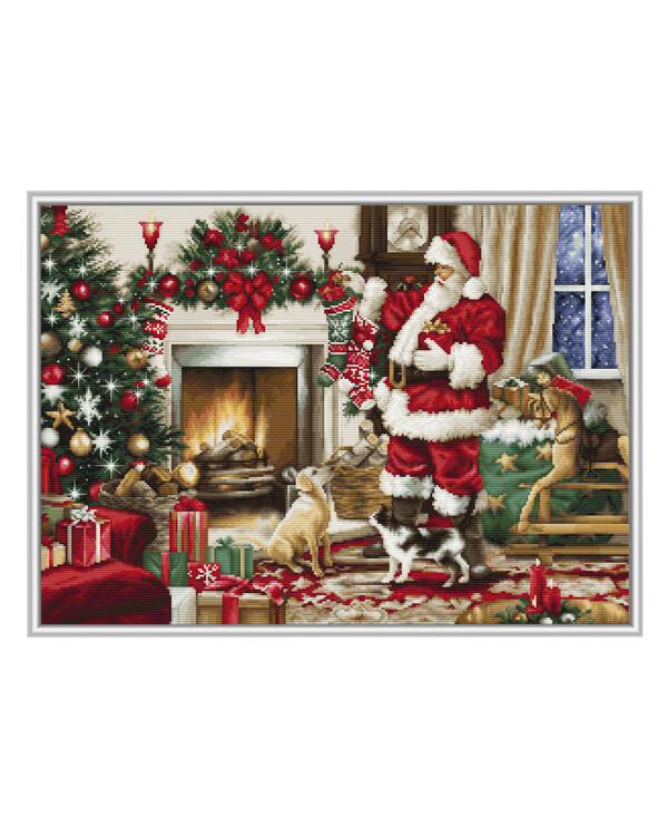 Luo joulun tunnelmallisin näkymä tällä yksityiskohtaisella kirjontatyöllä, jossa joulupukki valmistelee lahjoja takkatul...